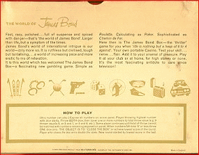 | "Fast, racy, polished...full of suspense and spiced with danger- that's 'the world of James Bond'. Larger than life, but a symptom of the times. James Bond's world of international intrigue is our world-only more so. It is ruthless but civilised, tough but tantalising...a world of increasing pace and more exotic forms of relaxation. It is this world which has welcomed The James Bond Box- a fascinating new gambling game. Simple as Roulette, calculating as Poker, sophisticated as Chemin de Fer. Here then is The James Bond Box- the 'thriller' game for you when 'life is nothing but a heap of 6 to 4 against'. Your own portable casino. Test you skill...nerve...flair, Add it to your arsenal of pleasure. Play it at your club or at home, for high stakes or none. Its the most fascinating antidote to care since television !" Phew ! | |